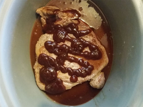 - Place in slow cooker and cover with half a small bottle of barbeque sauce of your choice. Add about 1 inch of water. Cook on Low for 6-7 hours.