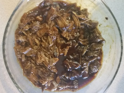 - Remove the roast and pull off any fat and discard. Then shred the roast with 2 forks.