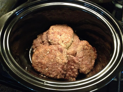 Put the steak in the crock pot as you remove it from the skillet. Add about an inch of water. Cook on low for 6 hours. Or if you want it to cook during Sunday church, cook for 1 hour on high, then turn to low for 3 hours. It will be ready when you get home for lunch.